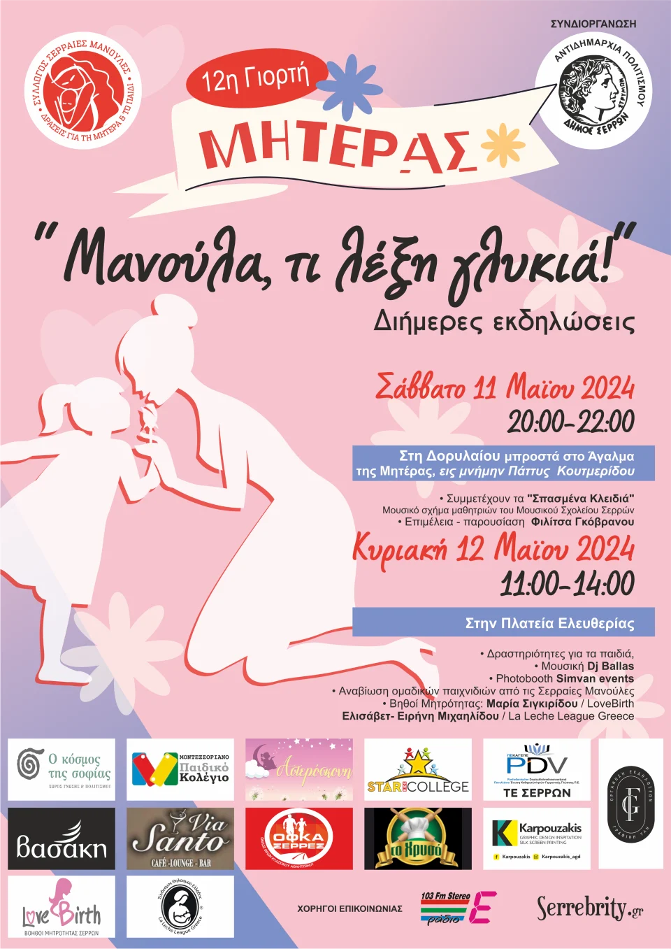 Την Κυριακή 12 Μαΐου 2024 από τις 11:00 έως τις 14:00 στην Πλατεία Ελευθερίας οι μανούλες γιορτάζουν και τα παιδάκια διασκεδάζουν με μουσική, χειροτεχνίες και παιχνίδια. Παράλληλα θα υπάρχει bazaar για ενίσχυση του Συλλόγου, photobooth για τις αναμνηστικές σας φωτογραφίες και γλυκίσματα.