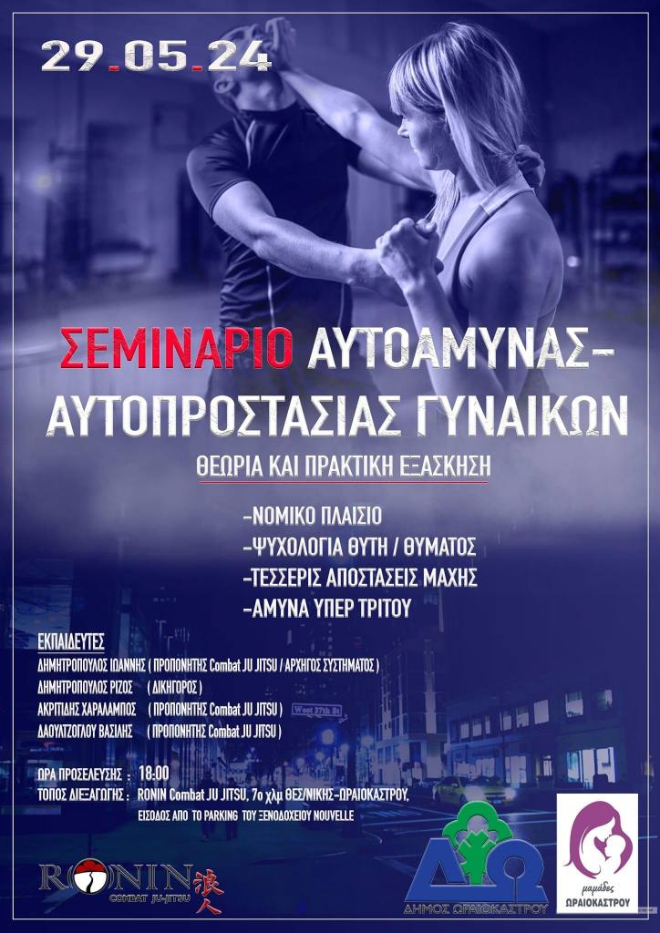 Δωρεάν σεμινάριο αυτοάμυνας -αυτοπροστασίας γυναικών θα πραγματοποιηθεί την Τετάρτη, 29 Μαΐου 2024, στις 6 το απόγευμα, από τον «Α.Σ. ΡΟΝΙΝ» σε συνεργασία με τον Δήμο Ωραιοκάστρου και την ομάδα «Μαμάδες Ωραιοκάστρου».