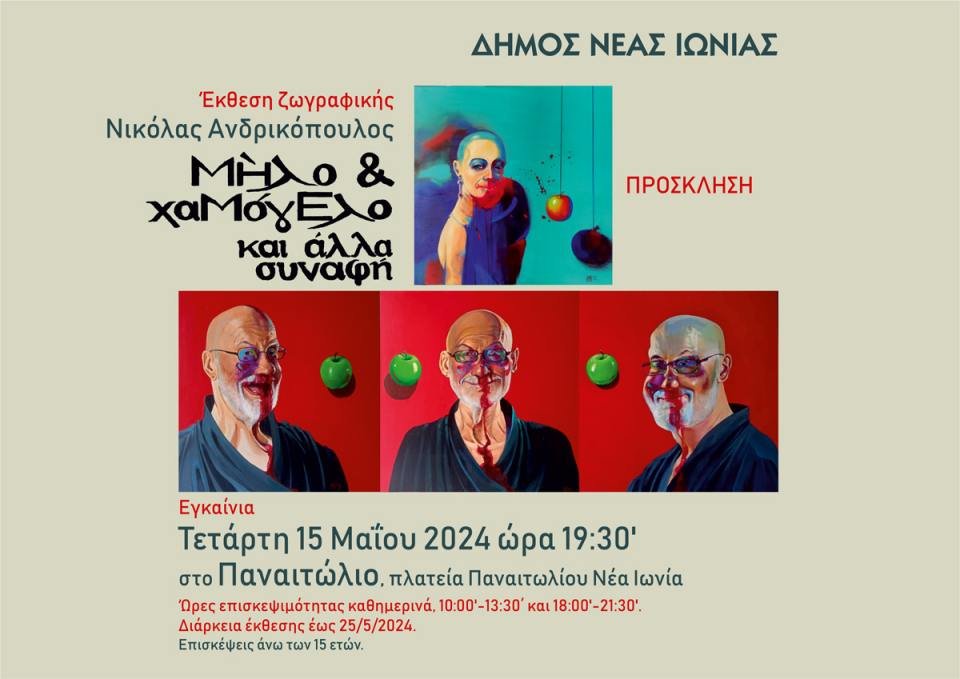 O Νικόλας Ανδρικόπουλος ζωγράφος-εικονογράφος,ενίοτε και συγγραφέας παιδικών βιβλίων μας προσκαλεί στα εγκαίνια της έκθεσης ζωγραφικής του με θέμα “Μήλο & χαμόγελο”, που θα γίνει στο ΠΑΝΑΙΤΩΛΙΟ στις 19:30 την Τετάρτη 15/5/2024. Η έκθεση θα διαρκέσει έως τις 25/5/2024.