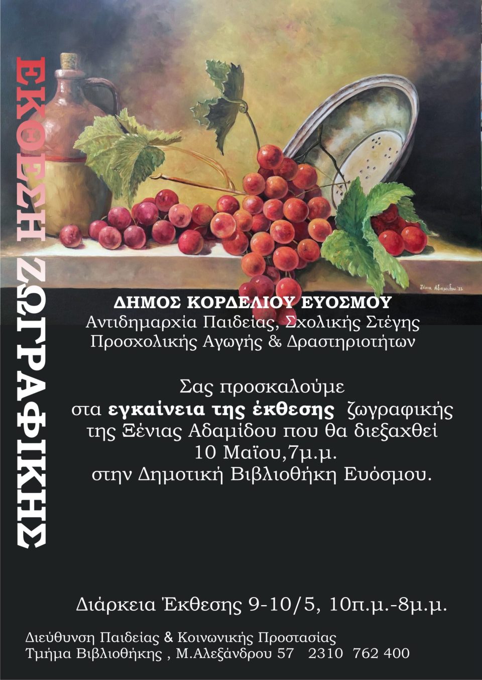Η Αντιδημαρχία Παιδείας Σχολικής Στέγης Προσχολικής Αγωγής & Δραστηριοτήτων δια της Βιβλιοθήκης Ευόσμου σας προσκαλεί, την Παρασκευή 10 Μαΐου 2024 στις 7.00μμ, στα εγκαίνια της Έκθεσης Ζωγραφικής της Ξένιας Αδαμίδου, στο χώρο της Δημοτικής Βιβλιοθήκης Ευόσμου.