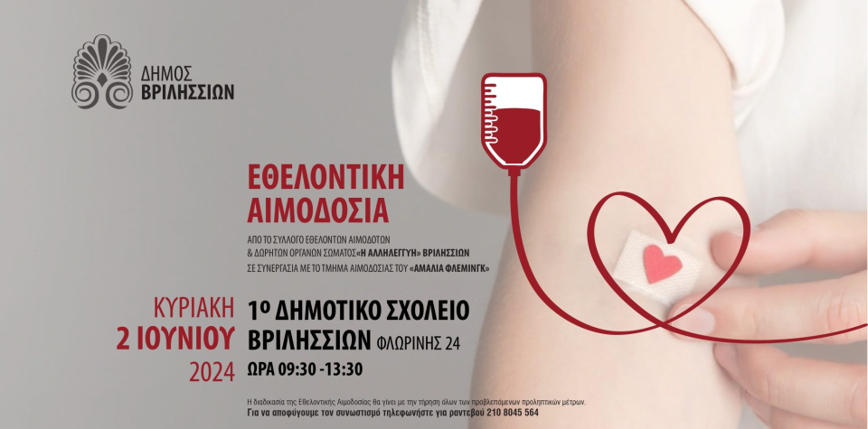 Την Κυριακή 2 Iουνίου 2024, ο Σύλλογος Εθελοντών Αιμοδοτών και Δωρητών Οργάνων «Η Αλληλεγγύη», σε συνεργασία με το Τμήμα Αιμοδοσίας του νοσοκομείου «Αμαλία Φλέμινγκ», τον Ιερό Ναό Αγίων Δώδεκα Αποστόλων Βριλησσίων και τον Ιερό Ναό Μεταμορφώσεως του Σωτήρος Βριλησσίων, διοργανώνουν εθελοντική αιμοδοσία στο 1ο Δημοτικό Σχολείο Βριλησσίων, οδός Φλωρίνης 24.