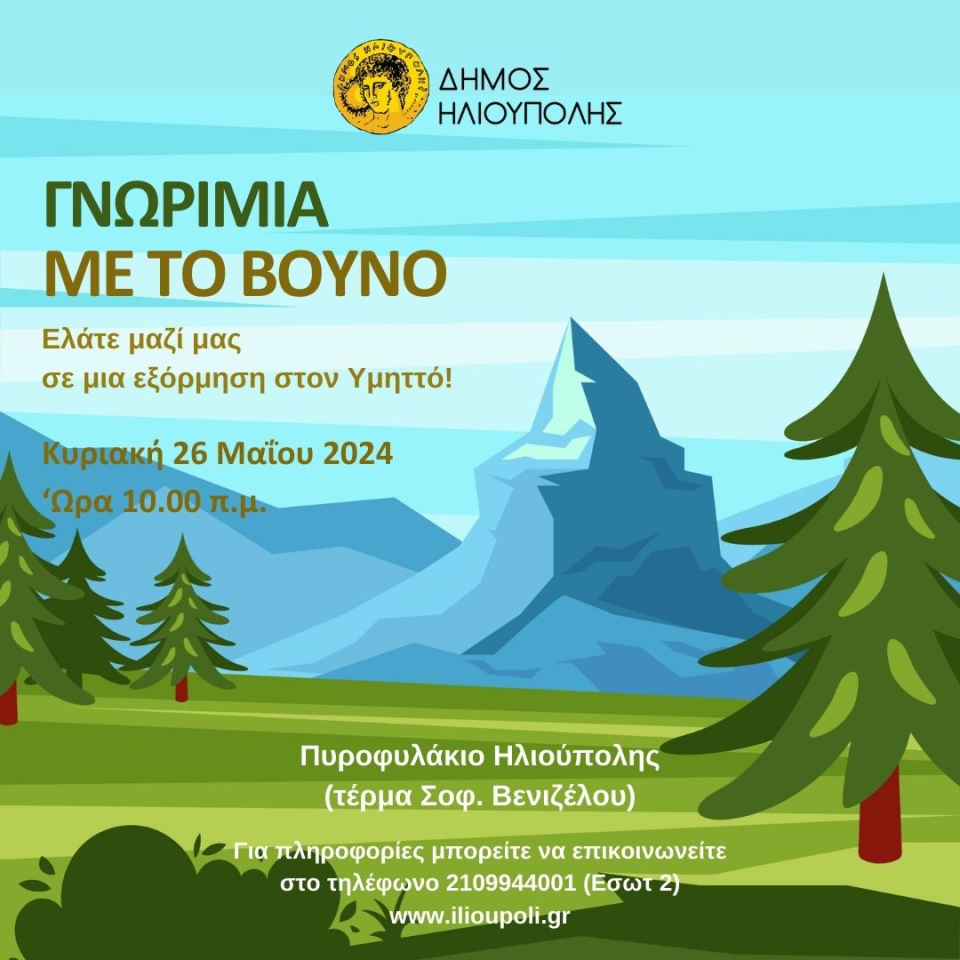 Ο Δήμος Ηλιούπολης σε συνεργασία με τον Ορειβατικό Σύλλογο Ηλιούπολης (Ε.Ο.Σ.Η.) και τη συνδρομή του Σώματος Ελλήνων Οδηγών και των Προσκόπων Ηλιούπολης, διοργανώνει την Κυριακή 26 Μαΐου 2024 και ώρα 10.00 π.μ. στο Πυροφυλάκιο Ηλιούπολης (τέρμα Σοφ. Βενιζέλου) μία Εκδήλωση Γνωριμίας με τον Υμηττό, έναν σημαντικό βιότοπο δίπλα στον ιστό της πόλης.