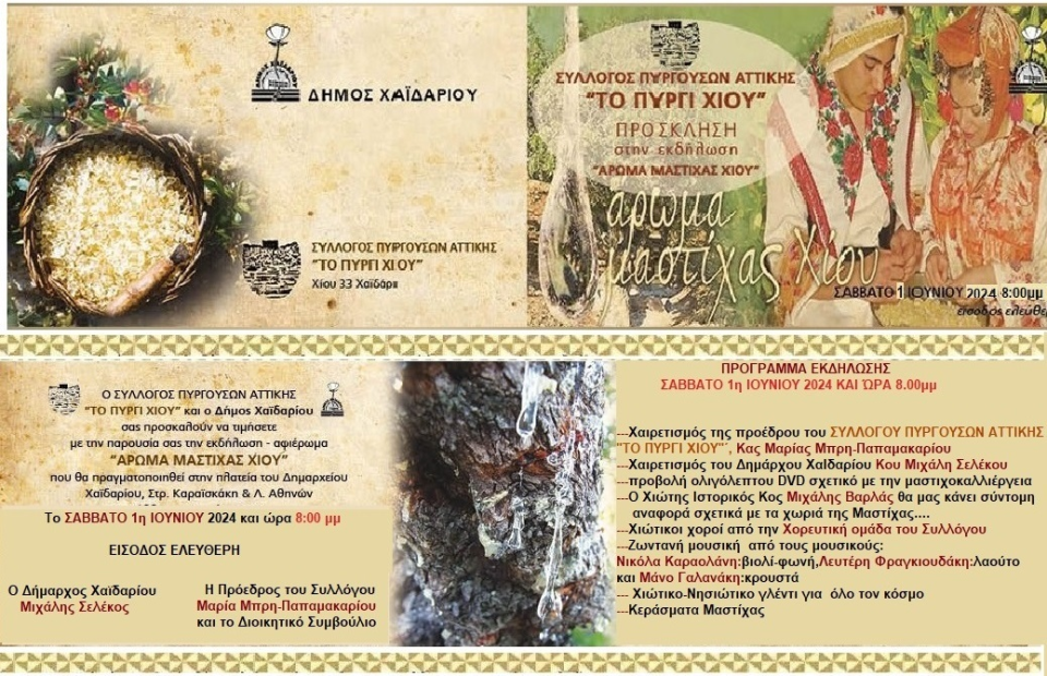 Ο Δήμος Χαϊδαρίου και ο Σύλλογος Πυργουσών Αττικής «Το Πυργί Χίου» προσκαλούν το κοινό στην εκδήλωση «Άρωμα Μαστίχας Χίου».Η εκδήλωση θα γίνει στην πλατεία του Δημαρχείου Χαϊδαρίου, το Σάββατο 1η Ιουνίου 2024 στις 20:00.