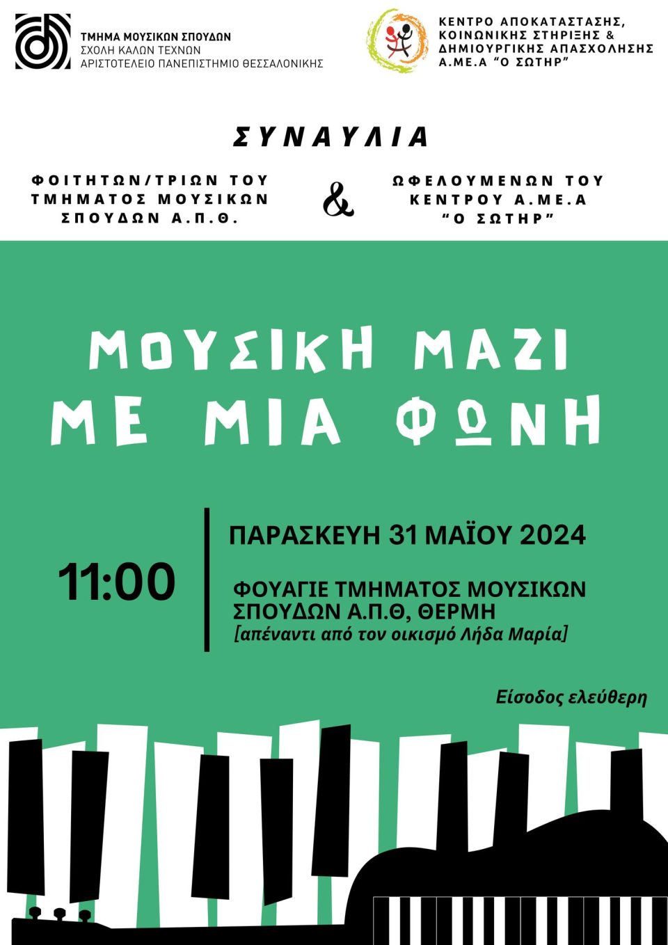 Σας περιμένουμε όλους στη συναυλία – σύμπραξη των ωφελουμένων του Φορέα μας με τους φοιτητές και τις φοιτήτριες από το Τμήμα Μουσικών Σπουδών ΑΠΘ την Παρασκευή 31 Μαΐου 2024 στις 11:00 στο Φουαγιέ του Τμήματος Μουσικών Σπουδών Α.Π.Θ στη Θέρμη (απέναντι από τον οικισμό Λήδα Μαρία).