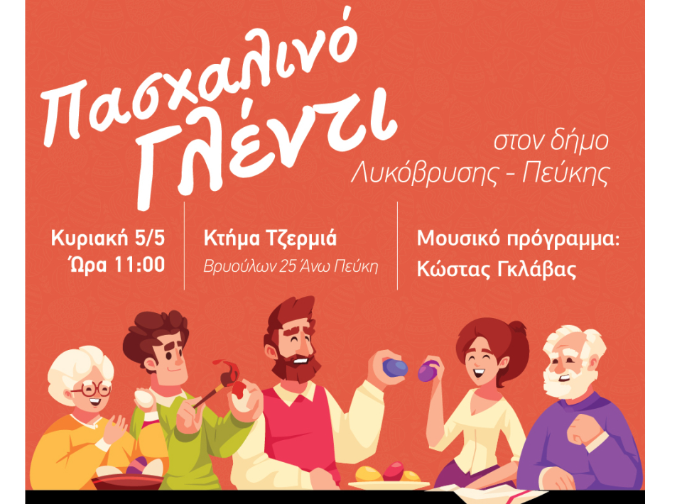 Ο δήμαρχος Λυκόβρυσης – Πεύκης, Μάριος Ψυχάλης, η πρόεδρος της Επιτροπής Πολιτισμού του Δήμου, Μαρίνα Σταυράκη – Πατούλη και το Δημοτικό Συμβούλιο του Δήμου Λυκόβρυσης – Πεύκης προσκαλούν τους πολίτες σε πασχαλινό εορτασμό την Κυριακή του Πάσχα, 5 Μαΐου 2024, στο Κτήμα Τζερμιά (Βρυούλων 25, Άνω Πεύκη), στις 11:00 π.μ.