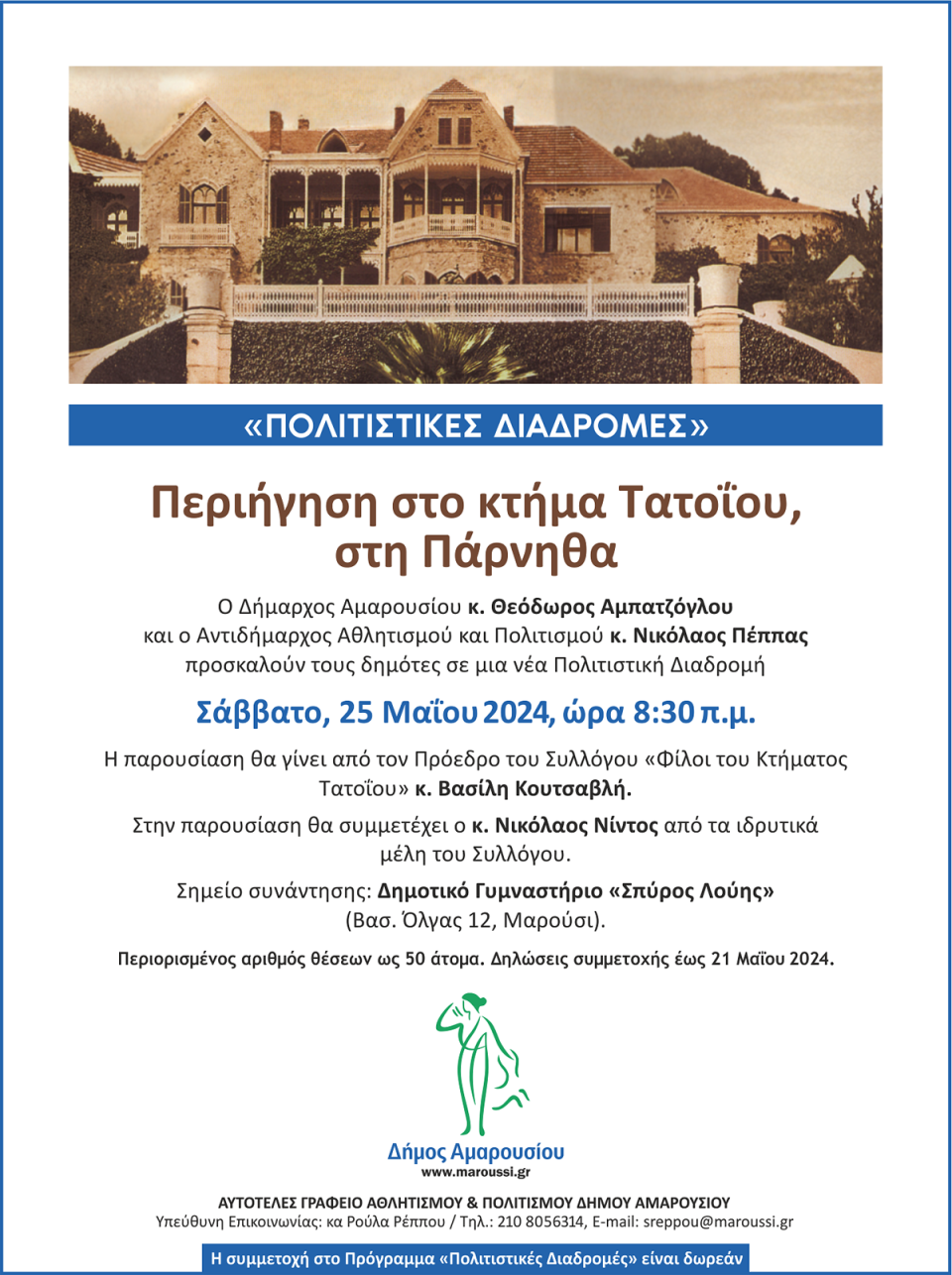Ο Δήμαρχος Αμαρουσίου κ. Θεόδωρος Αμπατζόγλου και ο Αντιδήμαρχος Αθλητισμού και Πολιτισμού κ. Νικόλαος Πέππας προσκαλούν τους δημότες σε μια νέα Πολιτιστική Διαδρομή με θέμα: «Περιήγηση στο κτήμα Τατοΐου, στη Πάρνηθα», το Σάββατο 25 Μαΐου 2024, ώρα 8:30π.μ.