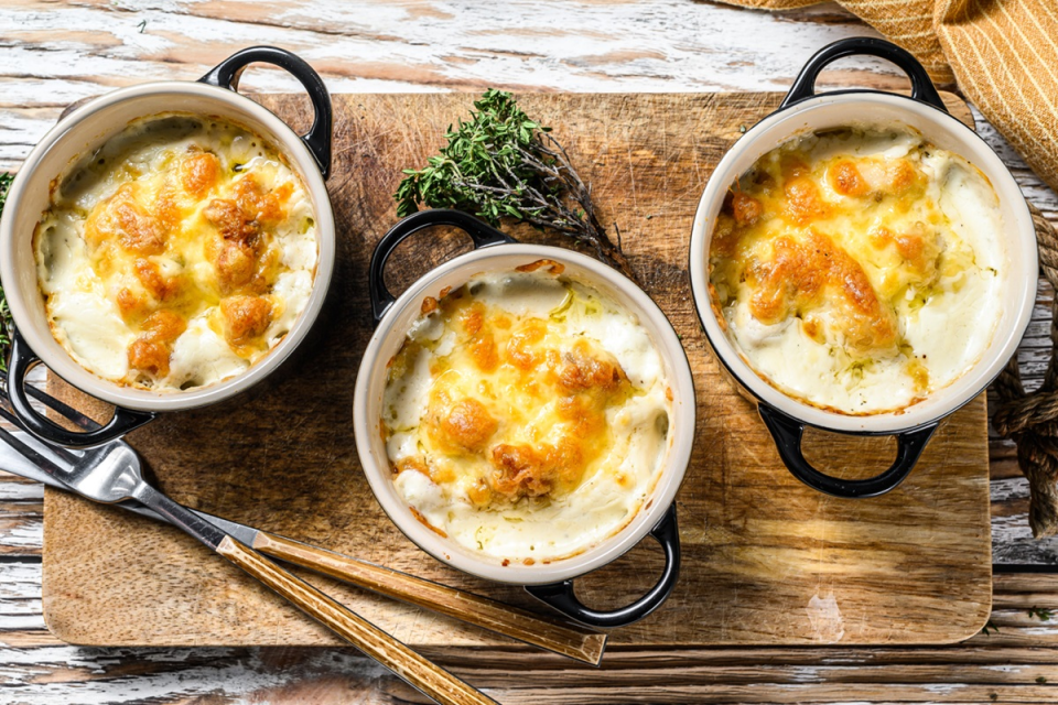 - Προθερμαίνετε τον φούρνο στους 180° C. Ρίχνετε το κοτόπουλο στην μπεσαμέλ, ανακατεύετε και μεταφέρετε το μείγμα σε ταψάκια ή ένα μεγαλύτερο ταψί. Πασπαλίζετε με το τυρί που φυλάξατε και ψήνετε για 30′ με 40’ λεπτά, μέχρι να πάρει χρώμα.