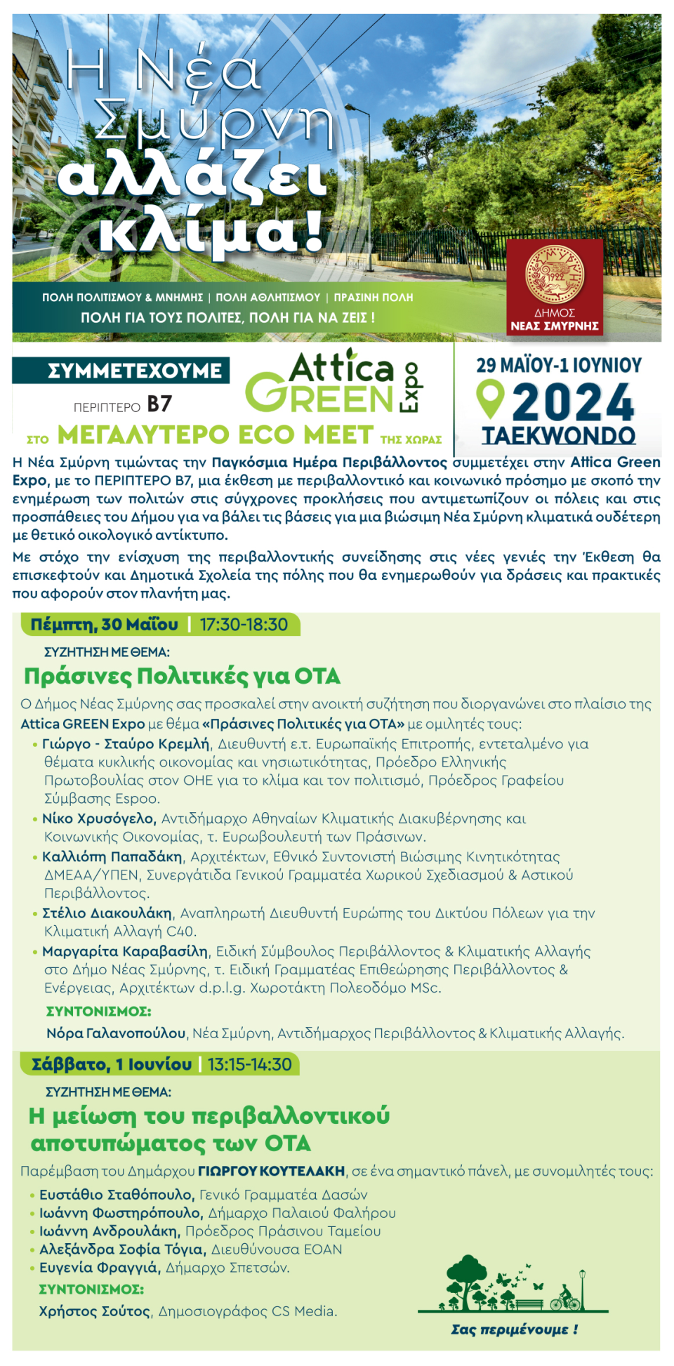 Θα προηγηθεί την Πέμπτη 30 Μαΐου ώρα 17:30 – 18:30 συζήτηση που διοργανώνει ο Δήμος Νέας Σμύρνης με θέμα «ΠΡΑΣΙΝΕΣ ΠΟΛΙΤΙΚΕΣ ΓΙΑ ΟΤΑ» με τη συμμετοχή έγκριτων επιστημόνων. Πρόκειται για τους: Γιώργο-Σταύρο Κρεμλή, Διευθυντής ε.τ. Ευρωπαϊκής Επιτροπής, εντεταλμένος για θέματα κυκλικής οικονομίας και νησιωτικότητας, Νίκος Χρυσόγελος, Αντιδήμαρχος Αθηναίων για την Κλιματική Διακυβέρνηση , Καλλιόπη Παπαδάκη, Εθνική Συντονίστρια Βιώσιμης Κινητικότητας ΔΜΕΑΑ/ΥΠΕΝ, Στέλιο Διακουλάκη, Αναπληρωτής Διευθυντής Ευρώπης του Δικτύου Πόλεων για την Κλιματική Αλλαγή C40 και Μαργαρίτα Καραβασίλη, Ειδική Σύμβουλος Περιβάλλοντος & Κλιματικής Αλλαγής στο Δήμο Νέας Σμύρνης.