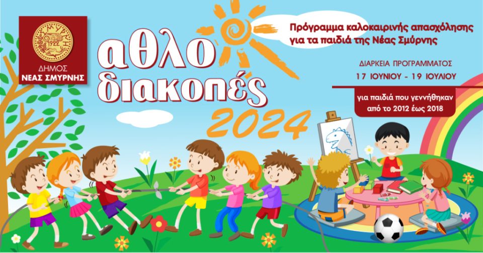 Ο Δήμος Νέας Σμύρνης και η Διεύθυνση Αθλητισμού, ενημερώνει τους γονείς παιδιών που γεννήθηκαν από το 2018 έως και το 2012 (6-12 ετών) ότι το πρόγραμμα «Αθλοδιακοπές» θα πραγματοποιηθεί φέτος από 17 Ιουνίου και θα είναι διάρκειας πέντε εβδομάδων, με λήξη στις 19 Ιουλίου 2024. Το πρόγραμμα θα λειτουργεί από Δευτέρα έως και Παρασκευή, κατά τις ώρες 07:30-16:00.