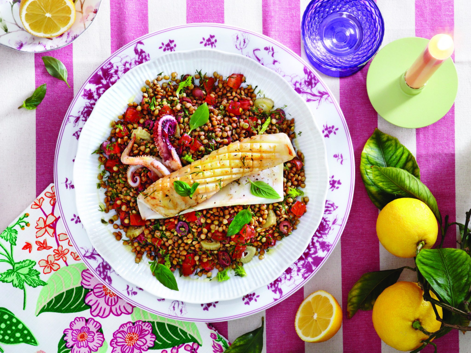 Σερβίρουμε την αρωματική φακοσαλάτα με το ψητό καλαμάρι.