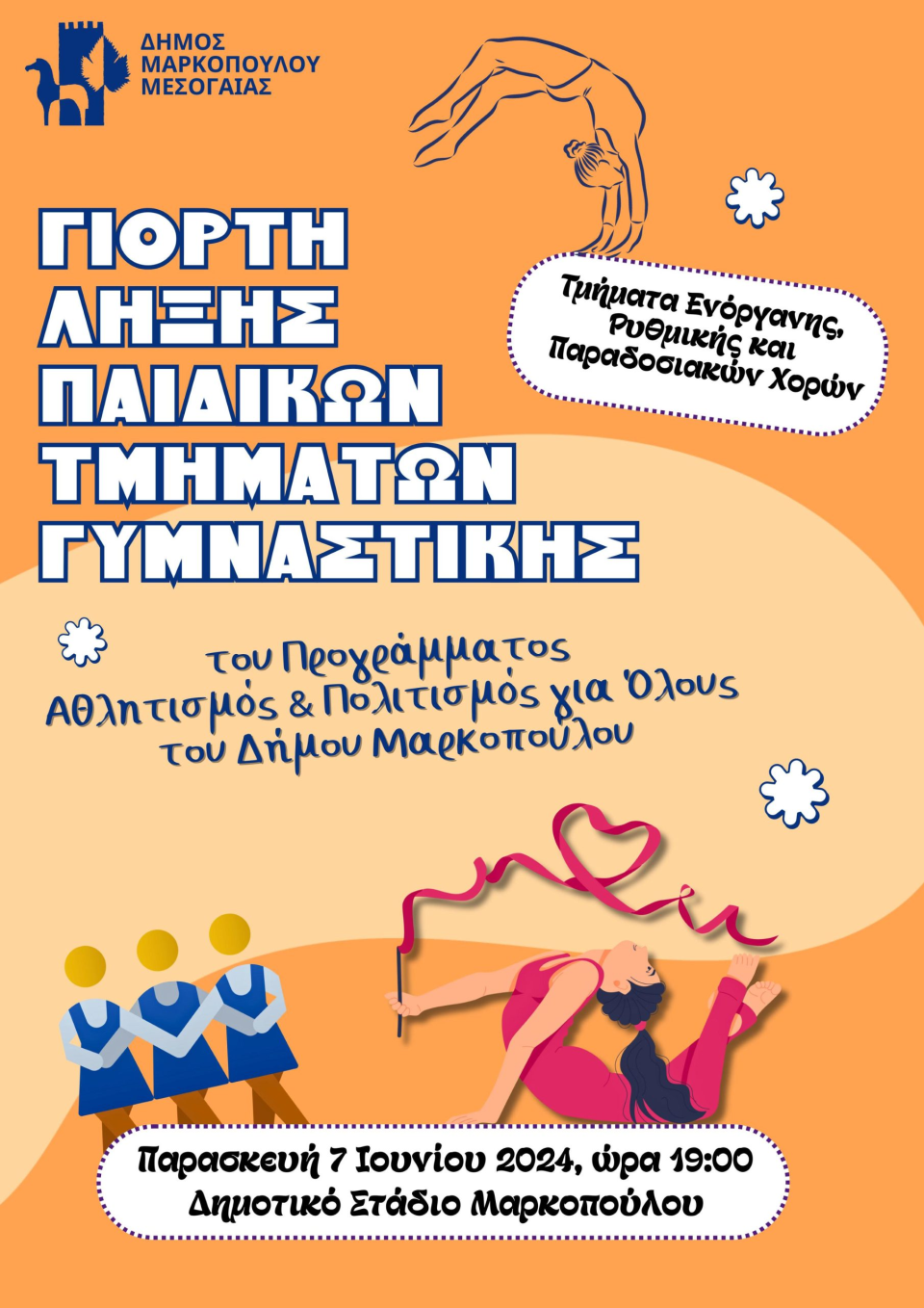 Ο Δήμος Μαρκοπούλου προσκαλεί τους πολίτες στη Γιορτή Λήξης των Παιδικών του Τμημάτων Γυμναστικής, του Προγράμματος «Αθλητισμός και Πολιτισμός για Όλους», για την περίοδο 2023-2024, που θα πραγματοποιηθεί την Παρασκευή 7 Ιουνίου 2024 και ώρα 19.00 στο Δημοτικό Στάδιο Μαρκοπούλου.