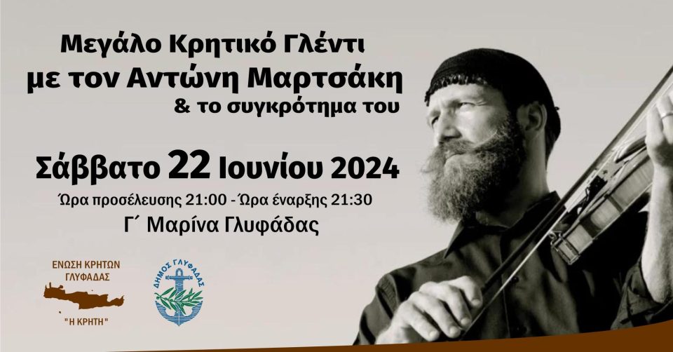 Το Σάββατο το βράδυ, στις 22 Ιουνίου, η Ένωση Κρητών Γλυφάδας συνδιοργανώνει μαζί με τον Δήμο Γλυφάδας στην Γ’ Μαρίνα μια βραδιά Κρητικής παραδοσιακής μουσικής με το συγκρότημα του Αντώνη Μαρτσάκη.