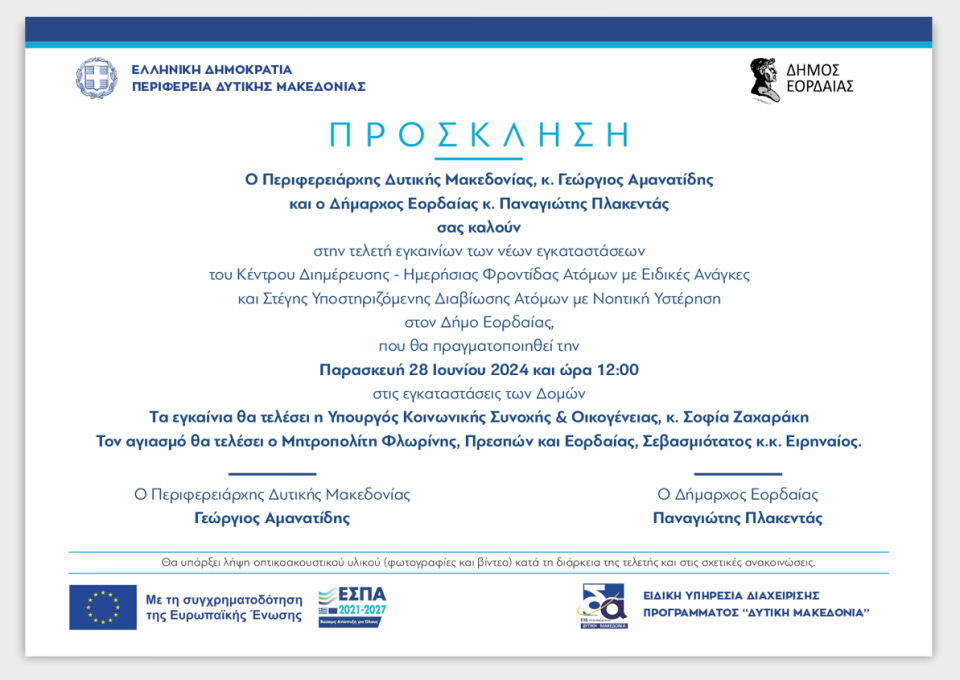 Τα εγκαίνια του Κέντρου Διημέρευσης- Ημερήσιας Φροντίδας Ατόμων με Ειδικές Ανάγκες και Στέγης Υποστηριζόμενης Διαβίωσης Ατόμων με Νοητική Υστέρηση στο Δήμο Εορδαίας, τελούν η Περιφέρεια Δυτικής Μακεδονίας και ο Δήμος Εορδαίας την Παρασκευή 28 Ιουνίου 2024 και ώρα 12.00.