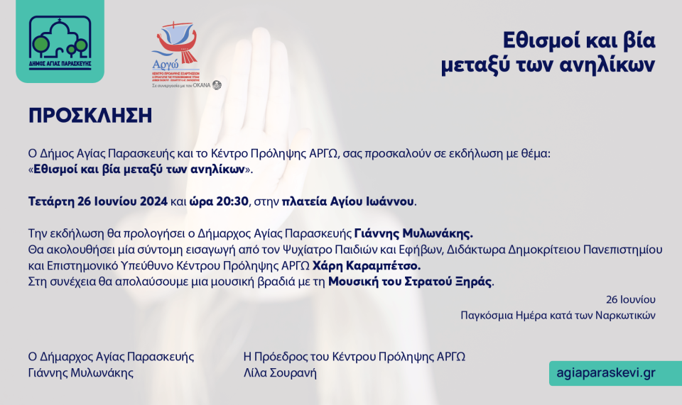 Με αφορμή την Παγκόσμια Ημέρα κατά των Ναρκωτικών, αύριο Τετάρτη 26 Ιουνίου και ώρα 20.30, ο Δήμος Αγίας Παρασκευής σε συνεργασία με το Κέντρο Πρόληψης «Αργώ», διοργανώνουν ενημερωτική εκδήλωση με θέμα «Εθισμοί και Βία μεταξύ των ανηλίκων», στην πλατεία Αγίου Ιωάννου.
