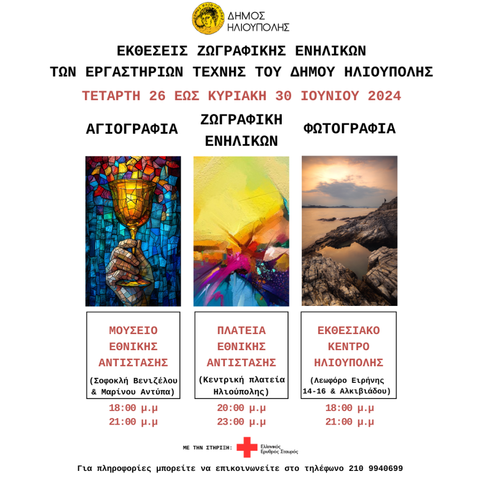 Ο Δήμος Ηλιούπολης σας προσκαλεί στις ετήσιες Εκθέσεις Ζωγραφικής ενηλίκων των Εργαστηρίων Τέχνης, όπου παρουσιάζεται η συλλογική προσπάθεια & το δημιουργικό έργο μαθητών και δασκάλων.