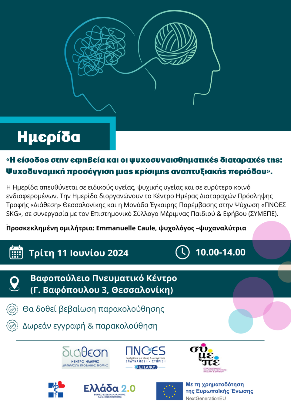 Η Εταιρεία Περιφερειακής Ανάπτυξης και Ψυχικής Υγείας (ΕΠΑΨΥ) σε συνεργασία με τον Επιστημονικό Σύλλογο Μέριμνας Παιδιού και Εφήβου (ΣΥΜΕΠΕ) διοργανώνουν στο Βαφοπούλειο Πνευματικό Κέντρο του Δήμου Θεσσαλονίκης, επιστημονική Ημερίδα με θέμα: «Η είσοδος στην εφηβεία και οι ψυχοσυναισθηματικές διαταραχές της: Ψυχοδυναμική προσέγγιση μιας κρίσιμης αναπτυξιακής περιόδου».