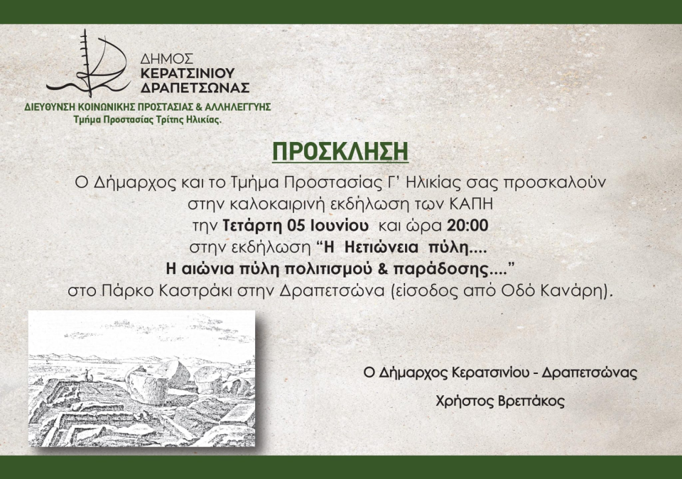 Ο Δήμος Κερατσινίου – Δραπετσώνας προσκαλεί τους πολίτες την Τετάρτη 5 Ιουνίου, στο Πάρκο Καστράκι (είσοδος από οδό Κανάρη) στην εκδήλωση – αφιέρωμα στην Ηετιώνεια Πύλη, σε ένα ταξίδι στον χώρο και στον χρόνο, σε μια καταγραφή τόπου, ανθρώπων και ιστοριών, όπου αναδύεται το ιστορικό παρελθόν της πόλης.