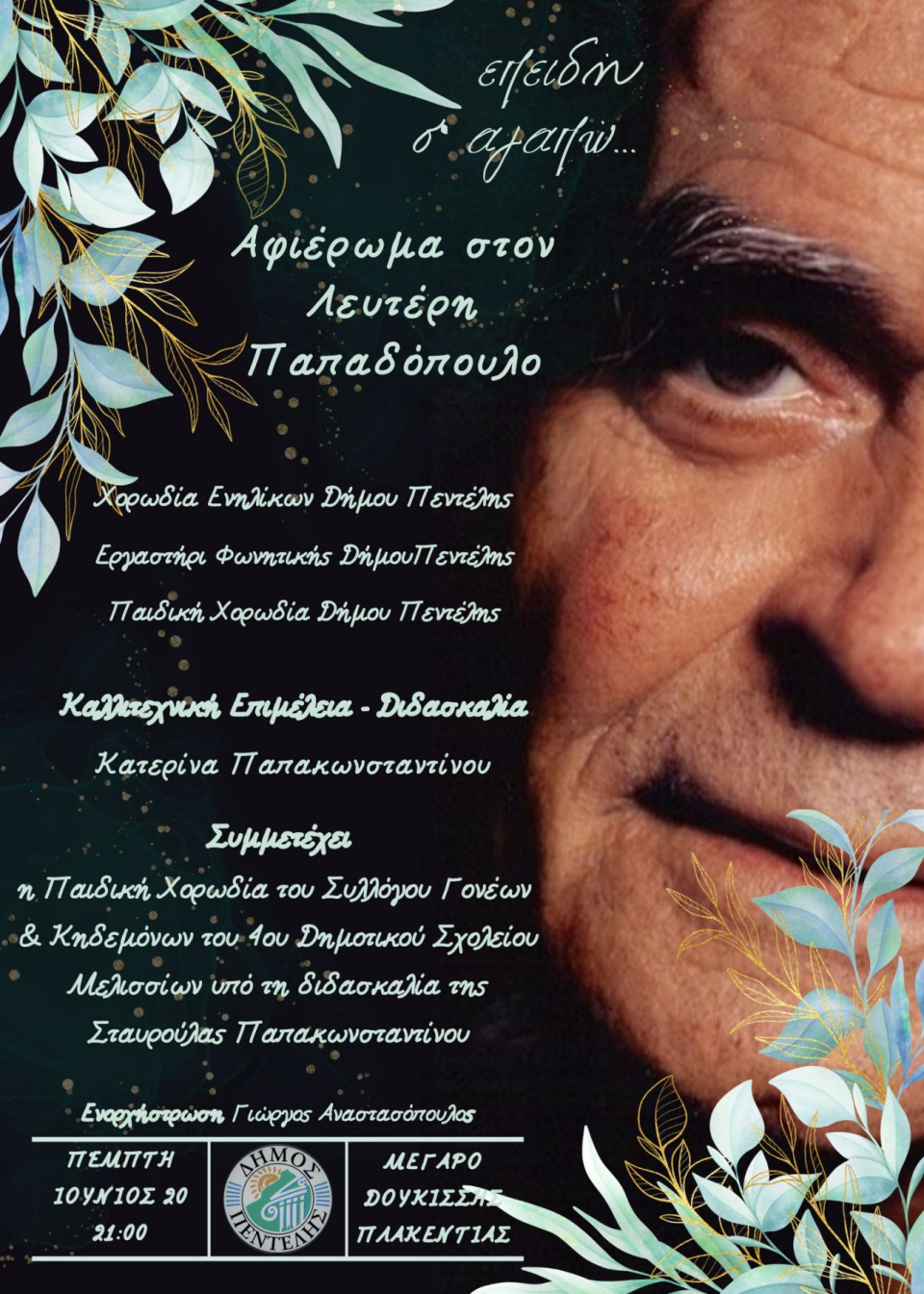 Ο Δήμος Πεντέλης προσκαλεί τους πολίτες στο μουσικό αφιέρωμα στον Λευτέρη Παπαδόπουλο “Επειδή σ’ αγαπώ’” με τη συμμετοχή της χορωδίας Ενηλίκων Δήμου Πεντέλης, του Εργαστηρίου Φωνητικής Δήμου Πεντέλης και της Παιδικής Χορωδίας του Δήμου Πεντέλης την Πέμπτη 20 Ιουνίου 2024 και ώρα 21.00, στο Μέγαρο Δουκίσσης Πλακεντίας της Δ.Κ. Πεντέλης (Λ. Βύρωνος 3 – Πεντέλη).