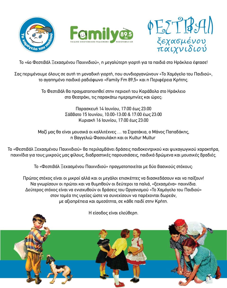 «Το Χαμόγελο του Παιδιού» και το «Παιδικό Ραδιόφωνο Family fm 89.5» σας προσκαλούν στο 4ο Φεστιβάλ Ξεχασμένου Παιχνιδιού που θα πραγματοποιηθεί την Παρασκευή 14 Ιουνίου 17:00μ.μ.-23:00μ.μ., το Σάββατο 15 Ιουνίου και ώρες 10:00π.μ.-13:00μ.μ. και 17:00μ.μ.-22:30μ.μ. και την Κυριακή 17 Ιουνίου, 17:00μ.μ.-23:00μ.μ., με δωρεάν είσοδο, στον Καράβολα Ηρακλείου, στο θεατράκι.