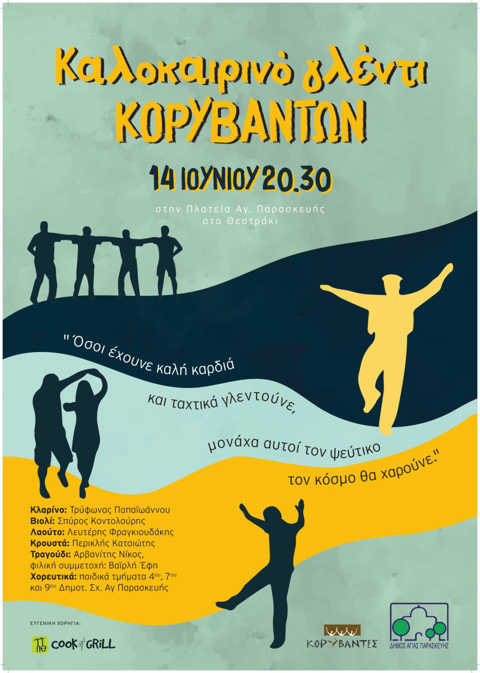 Ο πολιτιστικός σύλλογος “Κορύβαντες”, απευθυνόμενος στα μέλη, στους φίλους και σε όλους όσους αγαπούν την παραδοσιακή μουσική, διοργανώνει βραδιά γλεντιού στις 14 Ιουνίου και ώρα 20:30, στο οποίο θα λάβουν μέρος εκλεκτοί καλλιτέχνες του παραδοσιακού χώρου, στην Πλατεία της Αγίας Παρασκευής, με ελεύθερη είσοδο.