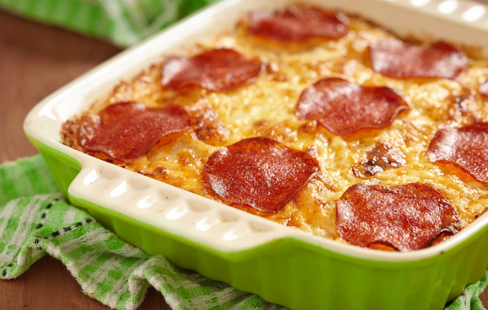 - Για την πρώτη στρώση, προσθέστε 3 φύλλα από τα λαζάνια σε ίση απόσταση το ένα από το άλλο. Προσθέστε άλλα 3/4 φλιτζανιού από τη σάλτσα μαρινάρα και απλώστε. Πασπαλίστε με 1 φλιτζάνι από τη μοτσαρέλα πάνω από τη σάλτσα και στη συνέχεια τοποθετήστε από πάνω 30 γρ. από το πεπερόνι.