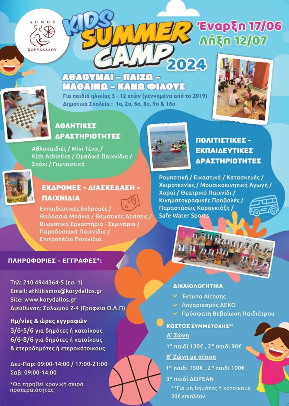 Οι εγγραφές για το Summer Camp Κορυδαλλού ξεκίνησαν ήδη! Το πρόγραμμα του camp (το οποίο ξεκινά 17 Ιουνίου και διαρκεί έως 12 Ιουλίου) περιλαμβάνει καθημερινά αθλητικές δράσεις, εικαστικά, δημιουργικές κατασκευές, θεατρικό παιχνίδι, χορό και σκάκι.