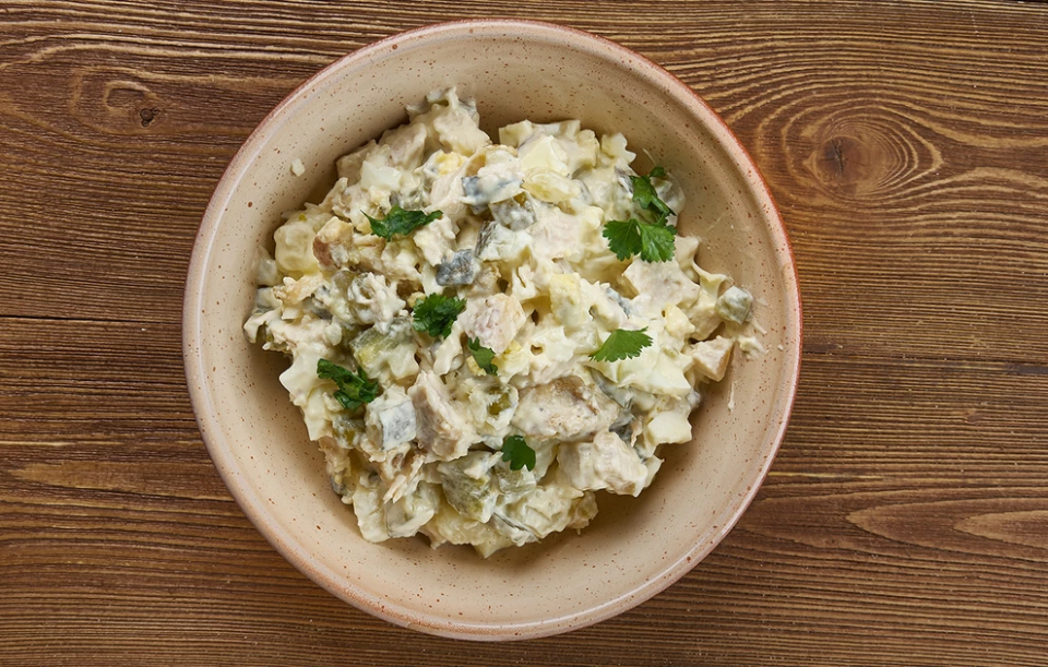 - Αφήστε την κοτοσαλάτα να παγώσει στο ψυγείο μέχρι να είστε έτοιμοι να το σερβίρετε.