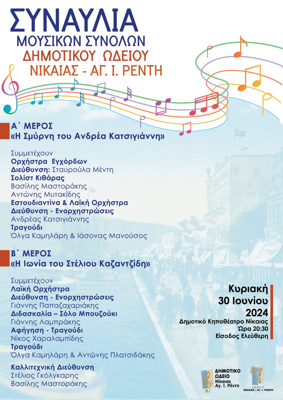 Αφιερωμένη στη «Σμύρνη του Ανδρέα Κατσιγιάννη» και στην «Ιωνία του Στέλιου Καζαντζίδη» είναι η συναυλία που θα πραγματοποιήσουν τα Μουσικά Σύνολα Δημοτικού Ωδείου Νίκαιας-Αγ .Ι. Ρέντη την Κυριακή 30 Ιουνίου στις 8.30 το βράδυ στο Δημοτικό Κηποθέατρο Νίκαιας, με είσοδο ελεύθερη για το κοινό.