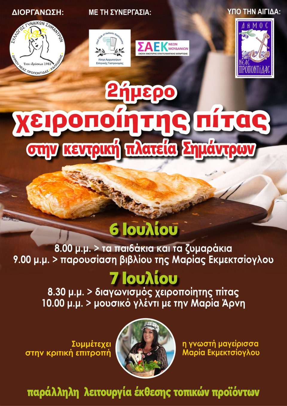 Ο Σύλλογος Γυναικών Σημάντρων σε συνεργασία με την Λέσχη Αρχιμαγείρων Ελληνικής Γαστρονομίας, τη Σχολή Ανώτερης Επαγγελματικής Κατάρτισης Ν. Μουδανιών και με τη στήριξη του Δήμου Νέας Προποντίδας θα πραγματοποιήσει “2ήμερο χειροποίητης πίτας” στην κεντρική πλατεία Σημάντρων.