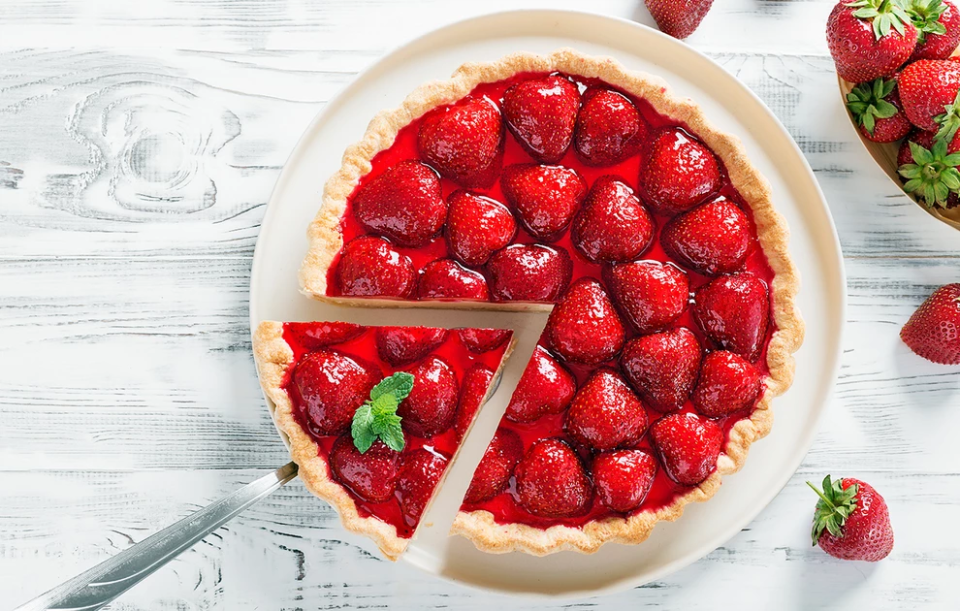 - Ανακατέψτε με ένα κουτάλι τη μαρμελάδα φράουλα για να χαλαρώσει και απλώστε τη στον πάτο της φόρμας. Βάλτε την κρέμα ζαχαροπλαστικής σε μια σακούλα ζαχαροπλαστικής και βάλτε τη σπειροειδώς πάνω από τη μαρμελάδα. Τοποθετήστε τις φράουλες πάνω από την κρέμα, δημιουργώντας ένα μοτίβο.