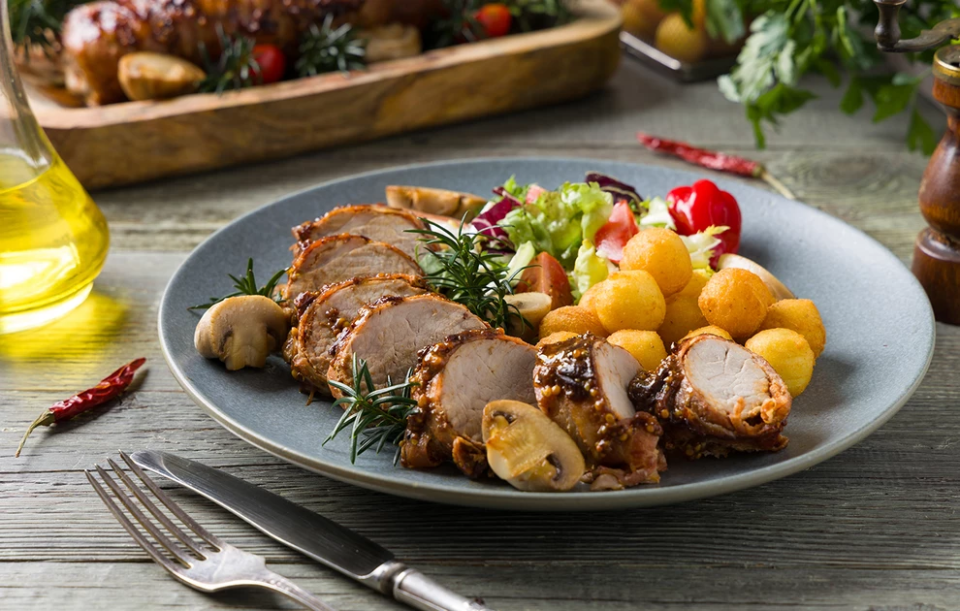- Αφού ξεκουραστεί, κόψτε το χοιρινό σε μενταγιόν και σερβίρετε.