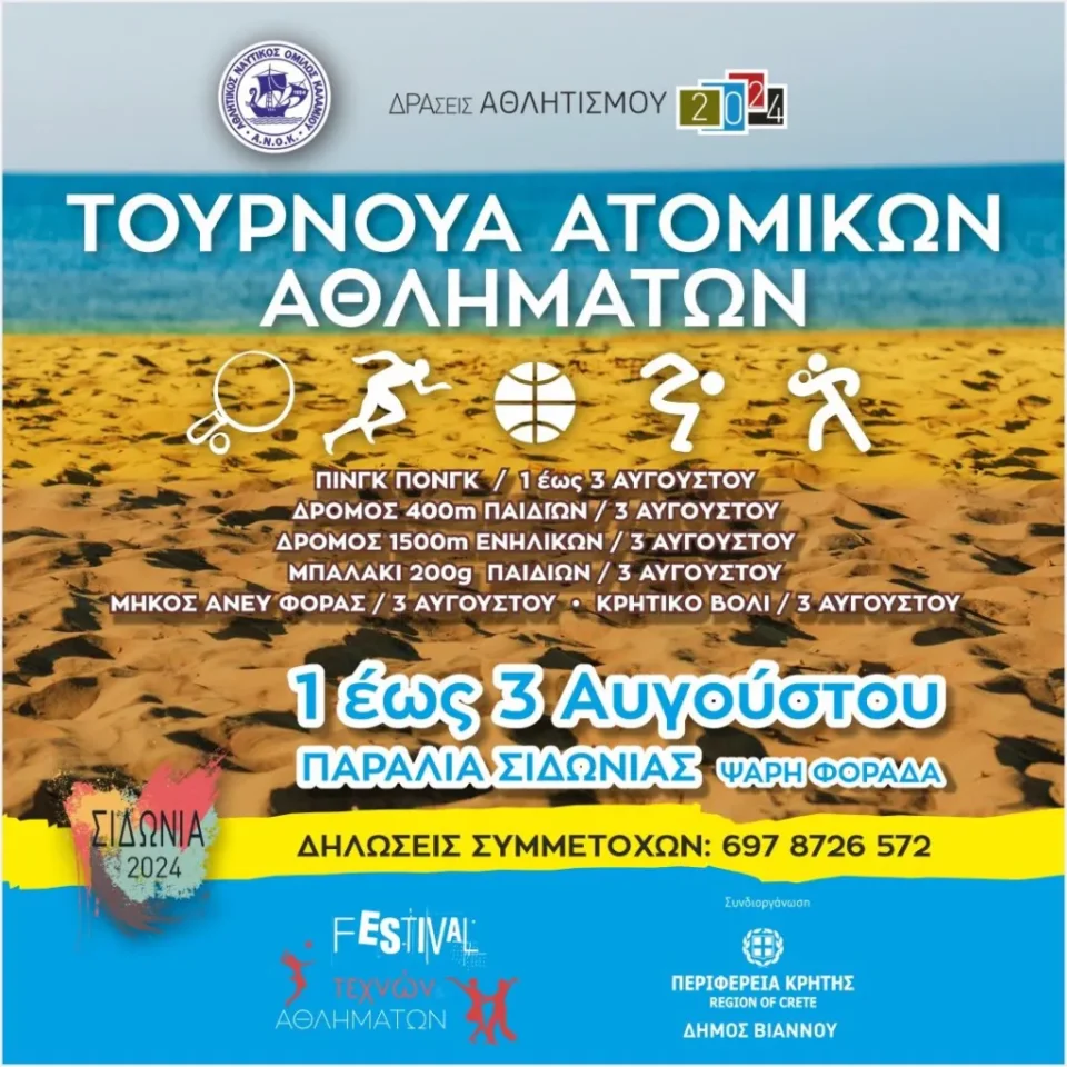 Ο Πολιτιστικός Σύλλογος Καλαμίου διοργανώνει για 29η χρονιά τις αθλητικές και πολιτιστικές εκδηλώσεις «Σιδώνια 2024». Οι αθλητικές εκδηλώσεις έχοντας ως στόχο την προαγωγή του λαϊκού αθλητισμού θα διαρκέσουν από 1 έως 3 Αυγούστου στην παραλία της Ψαρής Φοράδας.