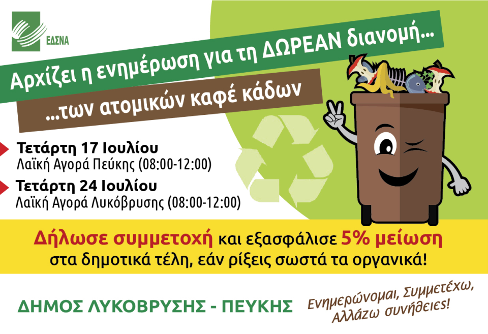 Υλοποιώντας τη δέσμευσή του για την ενίσχυση της ανακύκλωσης και της προστασίας του Περιβάλλοντος, ο Δήμος Λυκόβρυσης – Πεύκης αρχίζει την ενημέρωση των δημοτών, για το πρόγραμμα της δωρεάν διανομής ατομικών καφέ κάδων συλλογής οργανικών απορριμμάτων σε νοικοκυριά της πόλης.