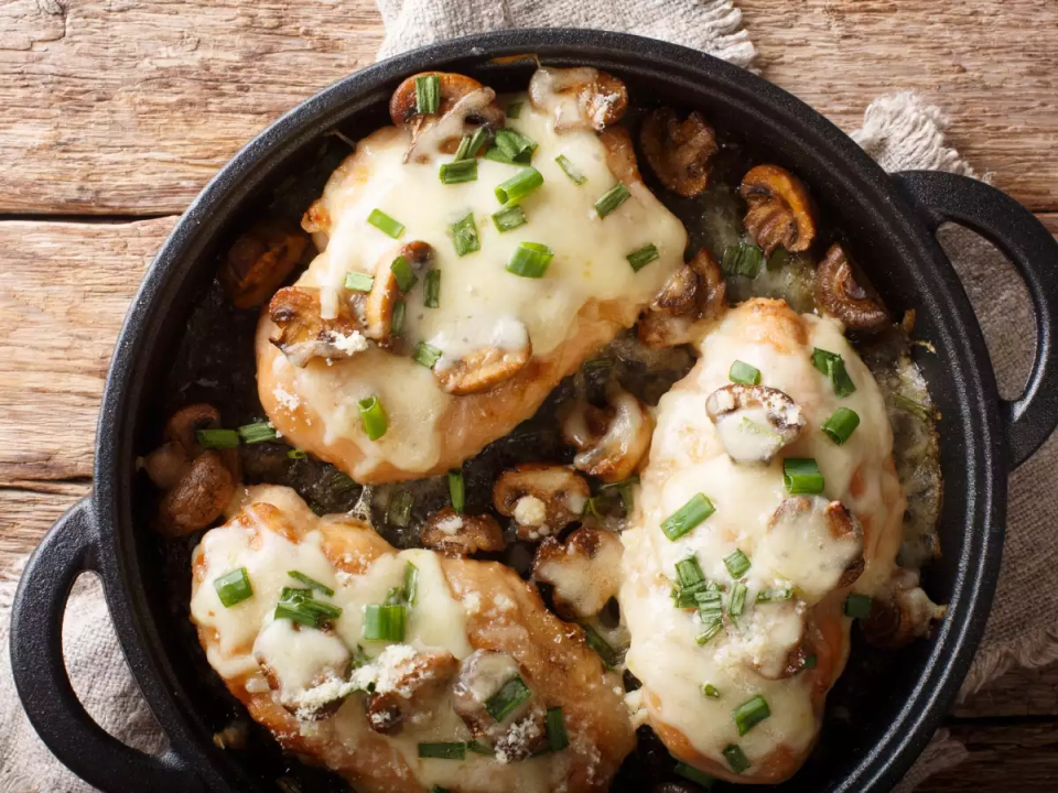 - Τοποθετείς το κοτόπουλο στο ταψί και ρίχνεις από πάνω τη μοτσαρέλα