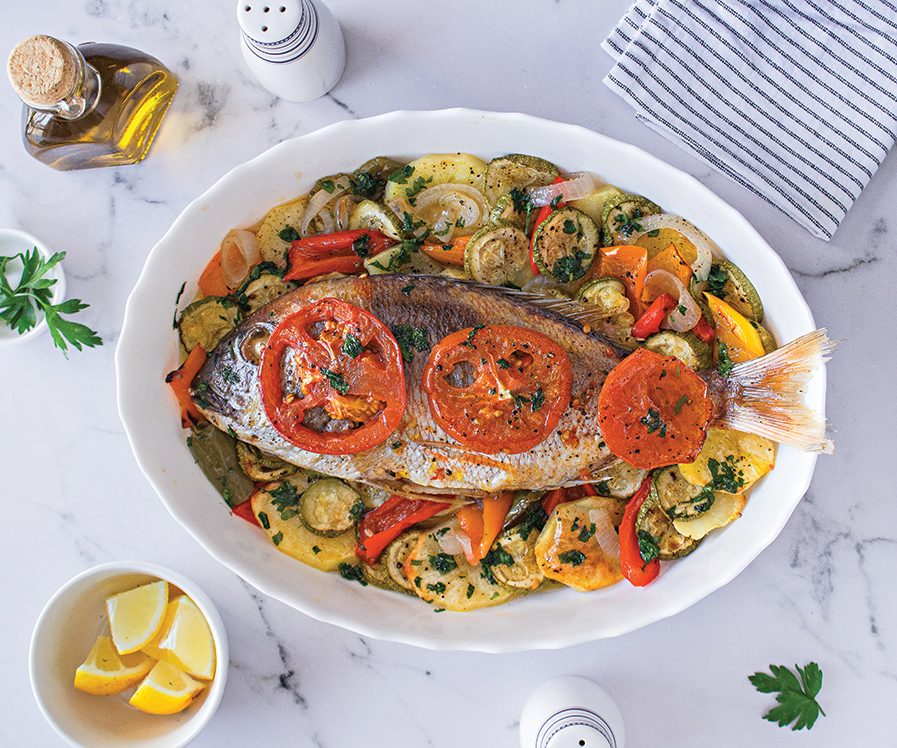 Λαδώνουμε εξωτερικά το φαγκρί και το ακουμπάμε πάνω στα μισοψημένα λαχανικά. Τοποθετούμε λεπτές φέτες ντομάτας στην επιφάνεια του ψαριού, το περιχύνουμε με τα υγρά του ταψιού και συνεχίζουμε το ψήσιμο για 25 λεπτά ακόμα. Αφήνουμε το φαγητό να σταθεί για 10 λεπτά εκτός φούρνου για να πιει τα υγρά του και σερβίρουμε.