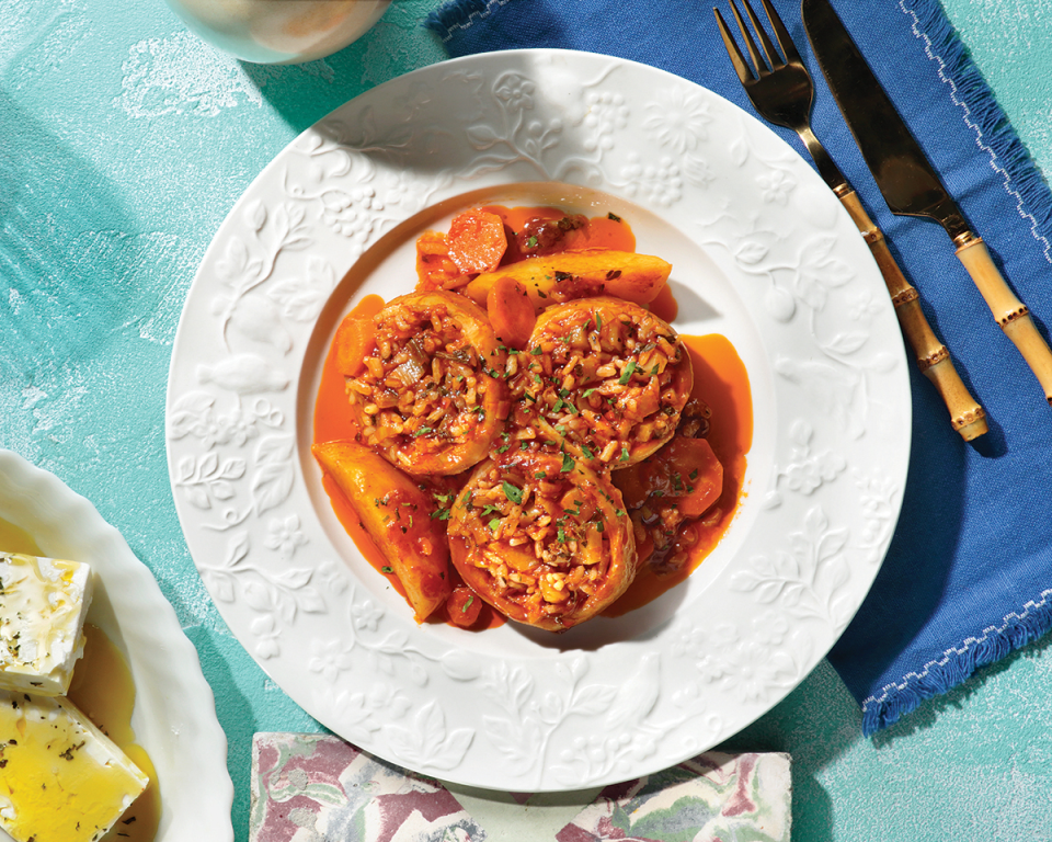 Γεμίζουμε τις αγκινάρες με το μείγμα, πιέζοντας να χωρέσει όσο πιο πολλή γέμιση γίνεται. Αν μας περισσέψει λίγη γέμιση, τη σκορπίζουμε στην κατσαρόλα.