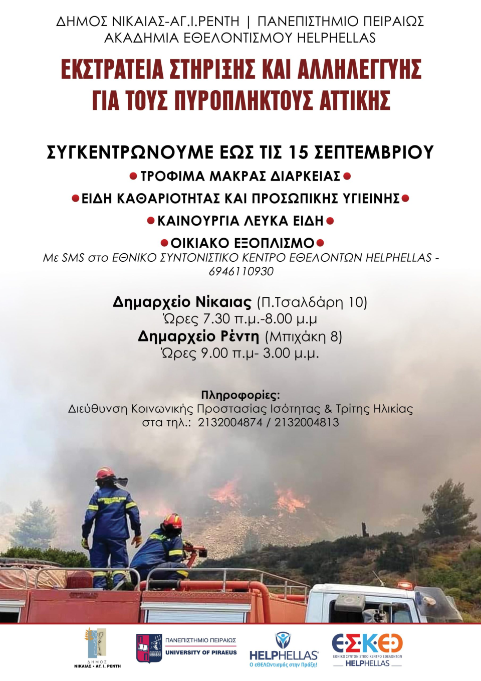 Ο Δήμος Νίκαιας – Αγ. Ι.Ρέντη, το Πανεπιστήμιο Πειραιώς και η Ακαδημία Εθελοντισμού HELPHELLAS, έχοντας ως στόχο την παροχή άμεσης βοήθειας στους συνανθρώπους μας που επλήγησαν από τις καταστροφικές πυρκαγιές, συνεχίζουν την εκστρατεία στήριξης και αλληλεγγύης προς τους πυρόπληκτους του Νομού Αττικής και συγκεντρώνουν :