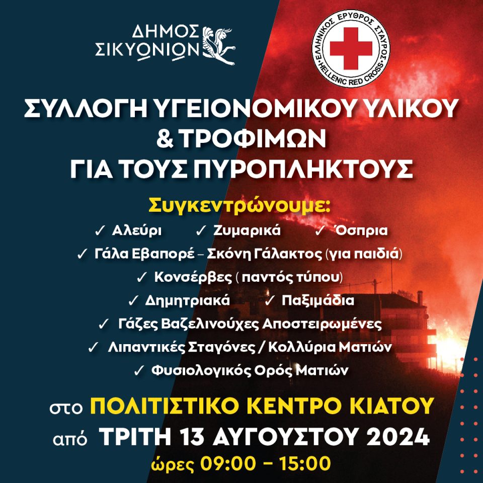 Γι’ αυτό ο Δήμος Σικυωνίων σε συνεργασία με τον Ελληνικό Ερυθρό Σταυρό οργανώνει από σήμερα, ΤΡΙΤΗ 13 ΑΥΓΟΥΣΤΟΥ 2024 συλλογή Υγειονομικού Υλικού και Τροφίμων για τους πυρόπληκτους συνανθρώπους μας.