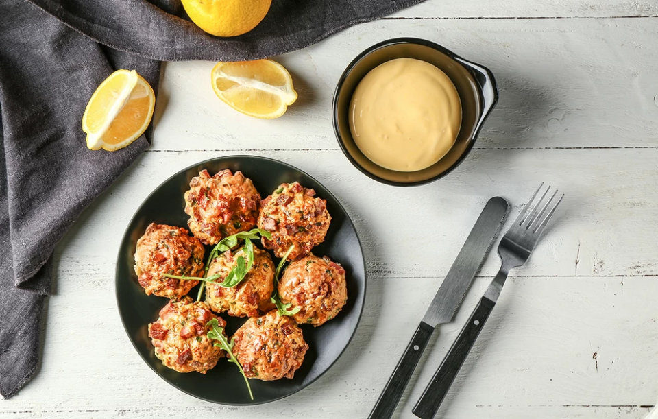 - Πλάστε το μείγμα σε περίπου 30 μπάλες σε μέγεθος καρυδιού και τοποθετήστε τα κεφτεδάκια σε ένα ταψί με λαδόκολλα.