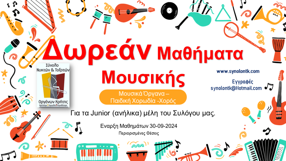 - Το Σύνολο Νυκτών & Τοξοτών Οργάνων Κρήτης αναπτύσσει την εκπαιδευτική του δράση, έτσι τα τακτικά μέλη του παρακολουθούν μαθήματα μουσικής καθώς και μαθήματα χορού και υποκριτικής.