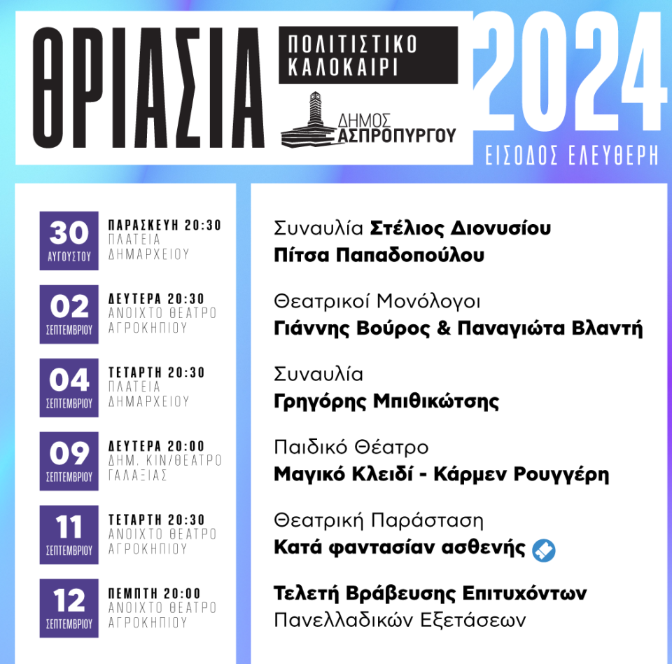 Με ένα πλούσιο πρόγραμμα γεμάτο συναυλίες, θεατρικές παραστάσεις και άλλες πολιτιστικές δράσεις, το φεστιβάλ “Θριάσια 2024” του Δήμου Ασπροπύργου στοχεύει να μετατρέψει την πόλη σε ένα επίκεντρο πολιτισμού.