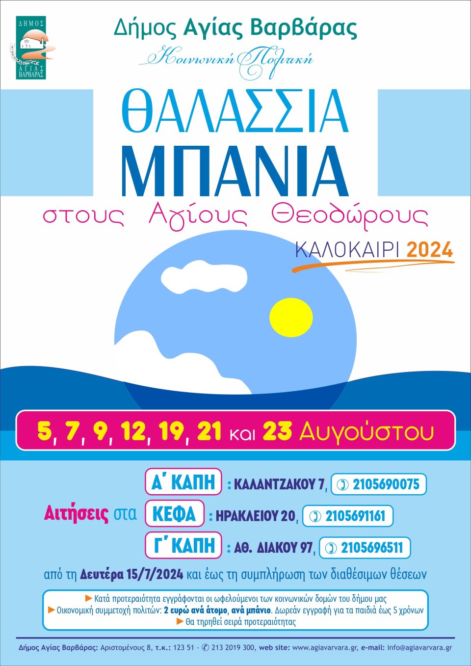 Ενημερώνουμε τους πολίτες ότι ο δήμος μας προγραμματίζει θαλάσσια μπάνια στους Αγίους Θεοδώρους, για τον μήνα Αύγουστο και ειδικότερα τις ημερομηνίες: 5, 7, 9, 12, 19, 21 και 23 Αυγούστου.