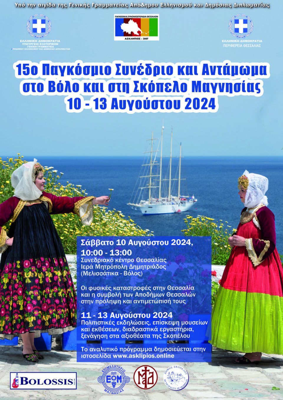 Η έναρξη του 15ου Παγκοσμίου Συνεδρίου και Ανταμώματος Θεσσαλών της Παγκόσμιας Συνομοσπονδίας Θεσσαλών «ΑΣΚΛΗΠΙΟΣ», θα γίνει το Σάββατο 10 Αυγούστου 2024 (10.00-13.00) στο Συνεδριακό Κέντρο Θεσσαλίας της Ιεράς Μητροπόλεως Δημητριάδος στα Μελισσάτικα του Βόλου και η συνέχεια θα δοθεί, από τις 11-13 Αυγούστου στη Σκόπελο, με πολιτιστικές εκδηλώσεις, επισκέψεις σε μουσεία και εκθέσεις, διαδραστικά εργαστήρια, ξεναγήσεις στα αξιοθέατα του νησιού κ.α.