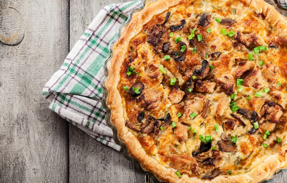 - Μεταφέρετε τη σφολιάτα στο ταψί και αλείψτε τα όρια με το χτυπημένο αυγό. Απλώστε ομοιόμορφα το τυρί μέσα στο περίγραμμα και καλύψτε με το μείγμα μανιταριών.