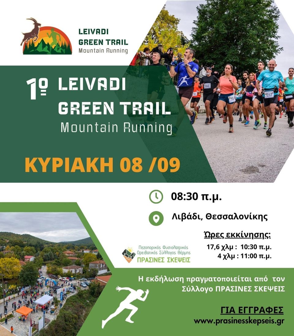Ο Πεζοπορικός Φυσιολατρικός Ορειβατικός Σύλλογος Θέρμης ΠΡΑΣΙΝΕΣ ΣΚΕΨΕΙΣ διοργανώνει στις 8 Σεπτεμβρίου εκδήλωση ορεινού τρεξίματος 17,6 χλμ και πεζοπορίας 4 χλμ στο Λειβάδι Θεσσαλονίκης.