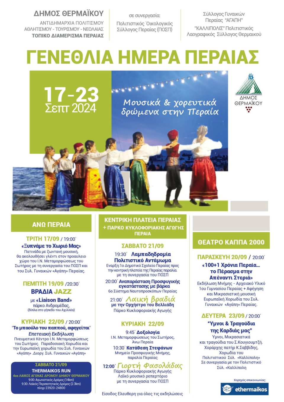 Από την Τρίτη 17 Σεπτεμβρίου θα ανοίξει το εξαήμερο των εορτασμών για τη γενέθλια ημέρα της Περαίας με πλούσια πολιτιστικά δρώμενα – Δείτε αναλυτικά το πρόγραμμα.