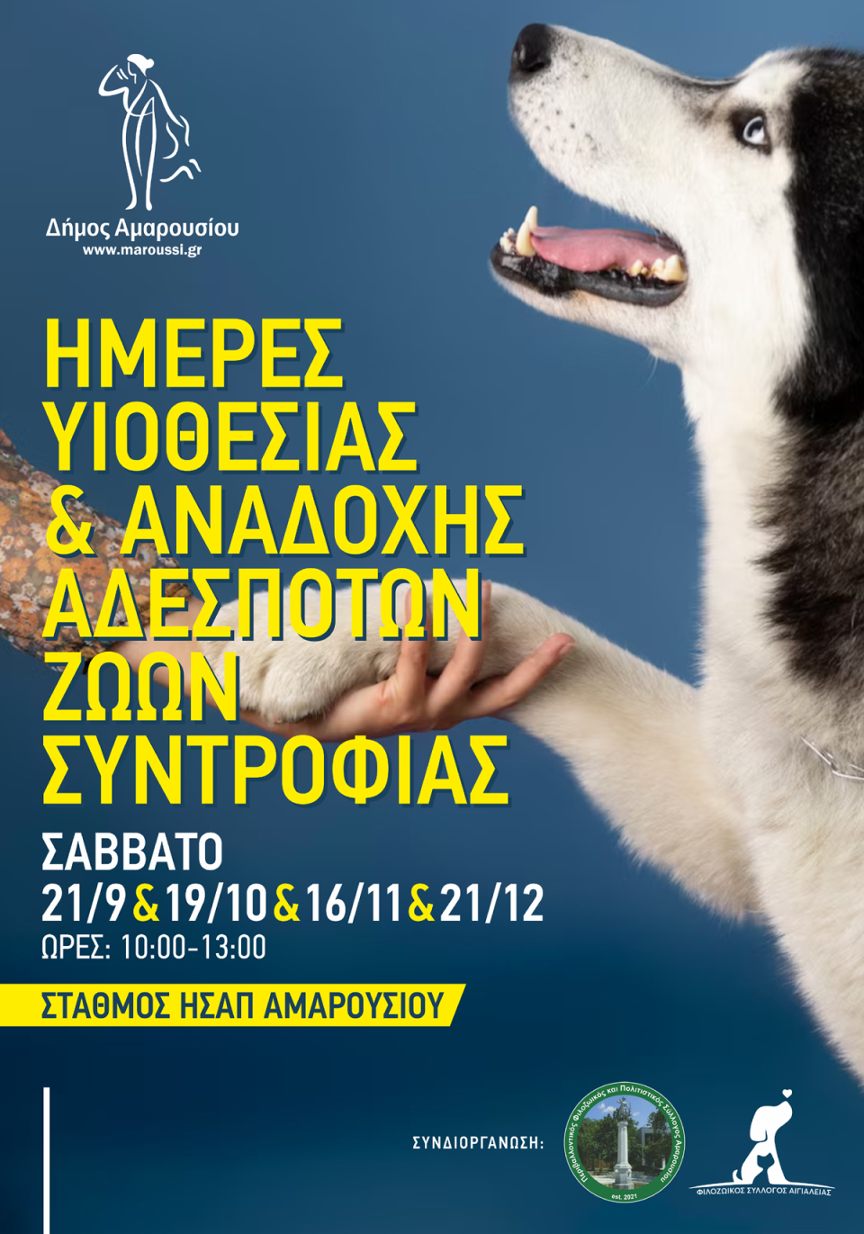Ο Δήμος Αμαρουσίου, σε συνεργασία με τους φιλοζωικούς συλλόγους Αμαρουσίου Πε.Φι.Πο. και Αιγιάλειας “Τα Φιλαράκια”, διοργανώνει «Ημέρα Υιοθεσίας Αδέσποτων Ζώων», προσκαλώντας όλους τους πολίτες να συμμετέχουν σε αυτή τη σημαντική πρωτοβουλία.