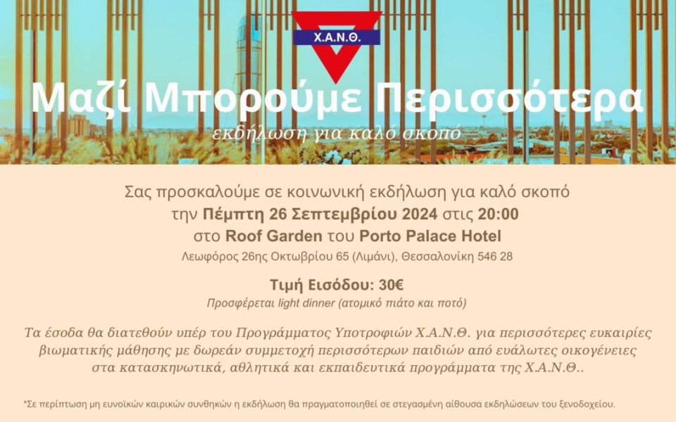 Σας προσκαλούμε σε κοινωνική εκδήλωση για καλό σκοπό, την Πέμπτη 26 Σεπτεμβρίου 2024 στις 20:00, στο Roof Garden του Porto Palace Hotel.