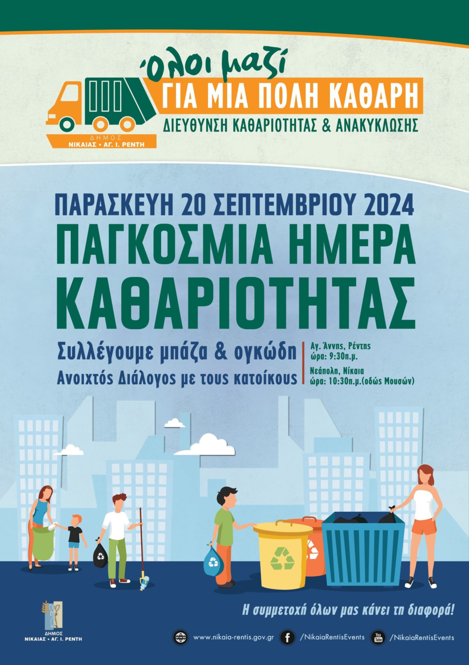 Συνεργεία της Διεύθυνσης Καθαριότητας και Ανακύκλωσης θα βρίσκονται στις 9.30 π.μ στην περιοχή Αγ. Άννης στο Ρέντη και στις 10.30 π.μ στη Νεάπολη Νίκαιας, έχοντας ως σημείο εκκίνησης την οδό Μουσών.