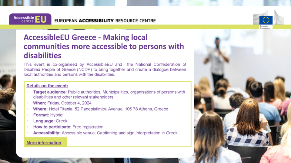 Στο πλαίσιο υλοποίησης του Έργου «Ευρωπαϊκό Κέντρο Πόρων Προσβασιμότητας (“AccessibleEU Resource Centre”) – AccessibleEU» -μια από τις εμβληματικές πρωτοβουλίες της Στρατηγικής της Ευρωπαϊκής Επιτροπής για τα Δικαιώματα των Ατόμων με Αναπηρία 2021-2030- έχουμε τη χαρά να σας προσκαλέσουμε να συμμετάσχετε στην υβριδική εκδήλωση δικτύωσης με θέμα «Κάνοντας τις τοπικές κοινωνίες περισσότερο προσβάσιμες στα άτομα με αναπηρία», η οποία θα πραγματοποιηθεί στις 4 Οκτωβρίου 2024 στο Ξενοδοχείο «ΤΙΤΑΝΙΑ», Πανεπιστημίου 52, Αθήνα (Αίθουσα «Απόλλων-Αθηνά», Ημιώροφος).